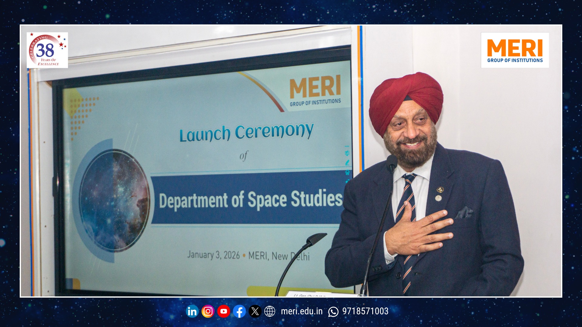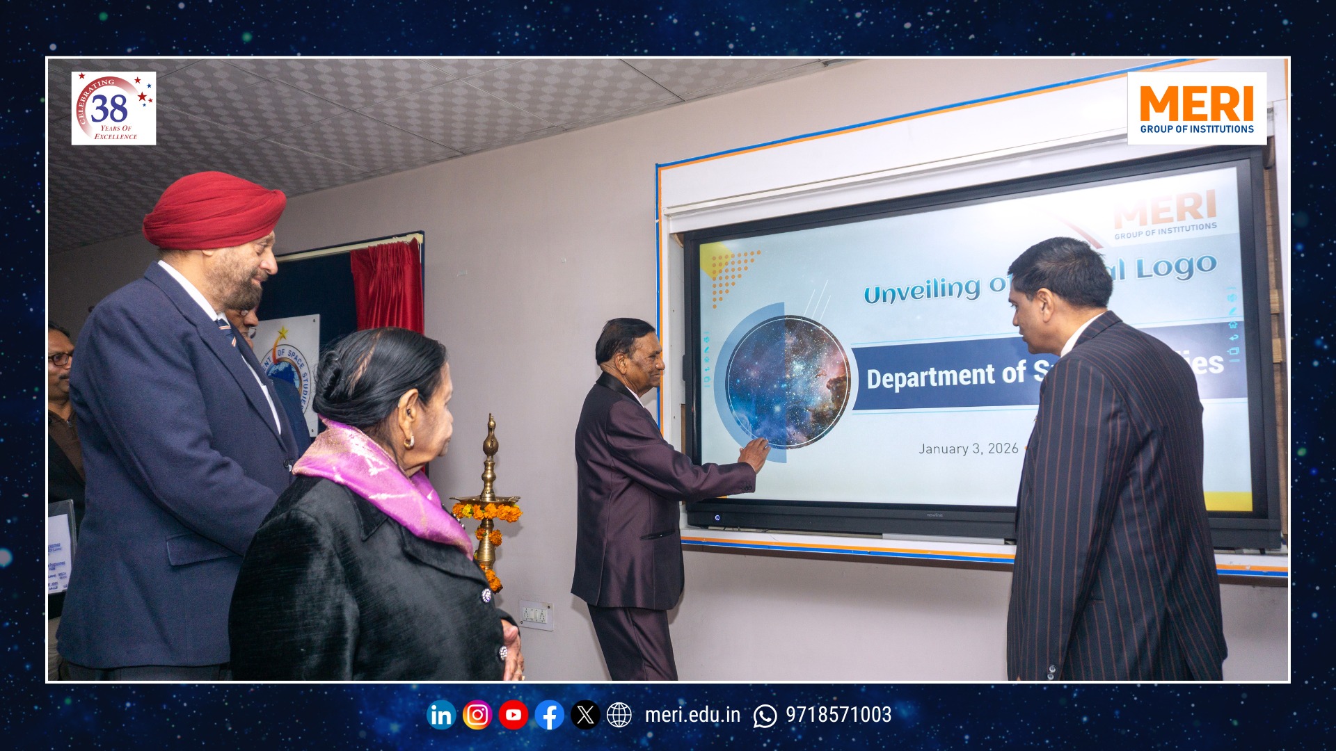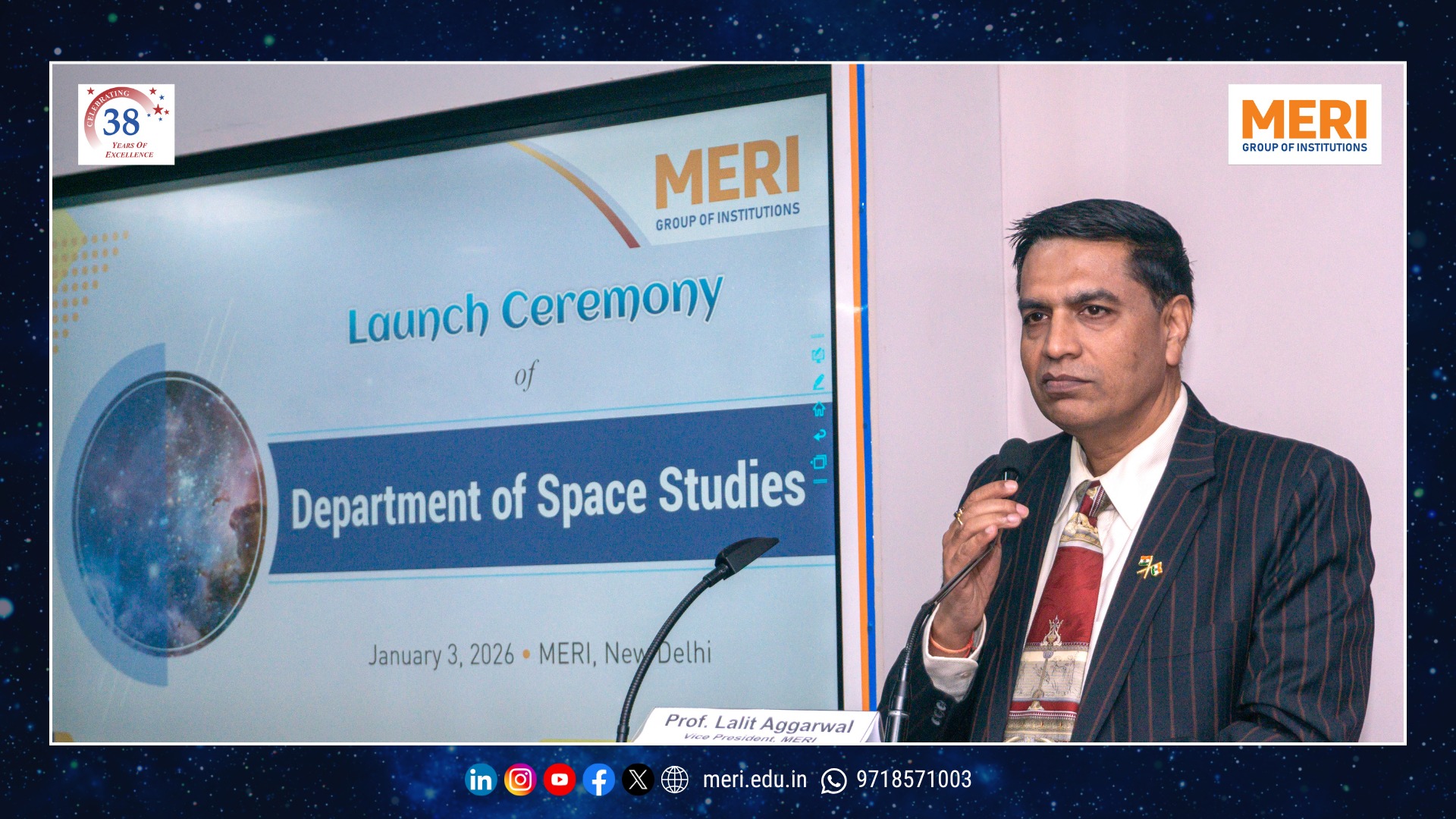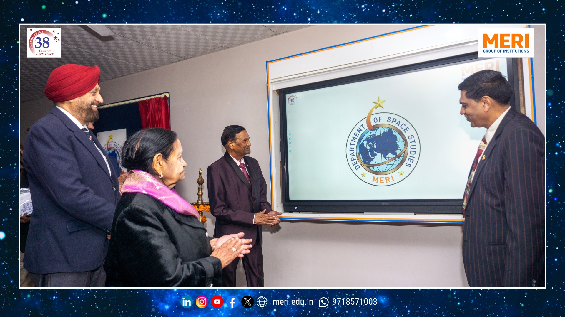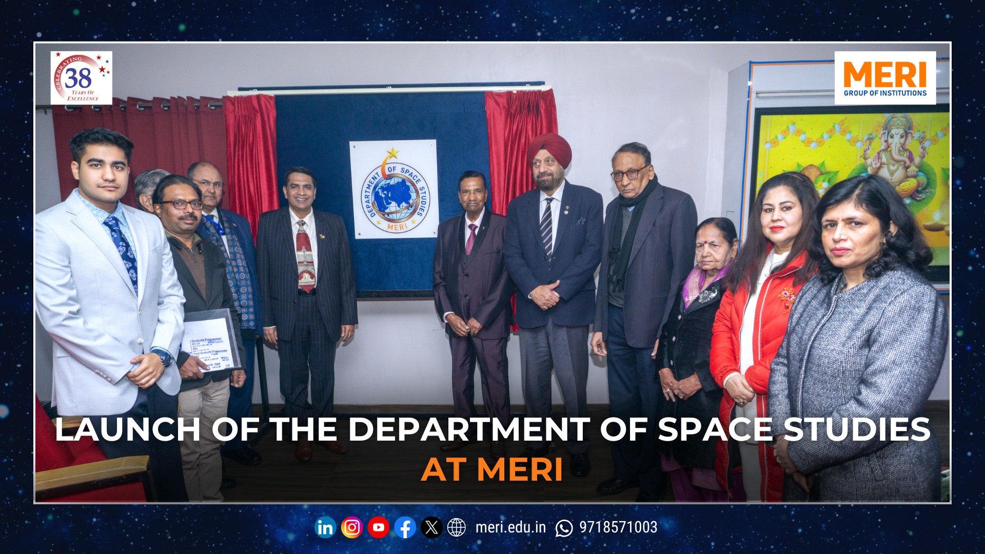 The Management Education and Research Institute (MERI) marked a key academic milestone with the launch of its Department of Space Studies, inaugurated by Sh. I. P. Aggrawal, Chairman, MERI Group of Institutions. Held with strong academic enthusiasm, the programme reaffirmed MERI’s commitment to futuristic and interdisciplinary education. The unveiling of the department’s digital logo highlighted the expanding scope of space science—integrating technology, management, policy, and innovation in alignment with India’s emergence as a techno-economic power.