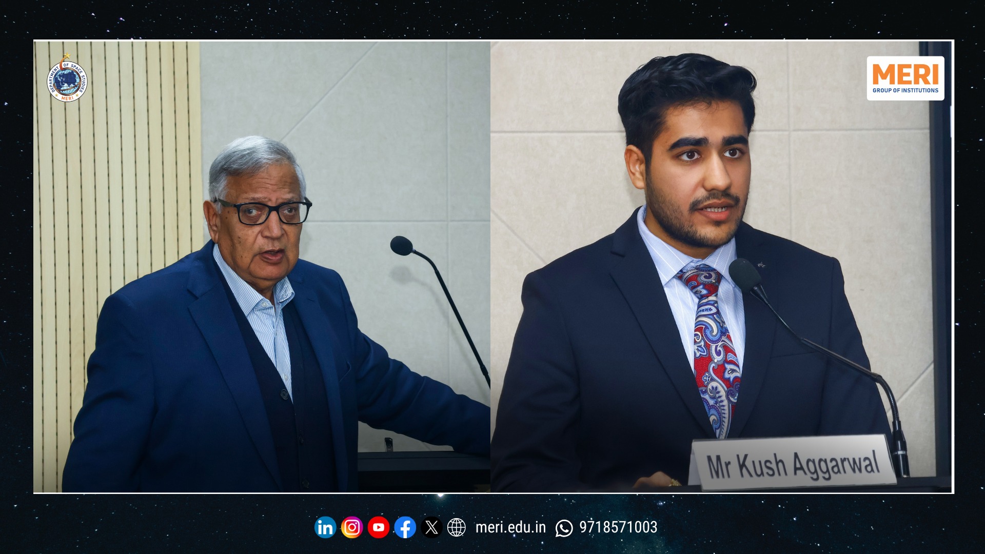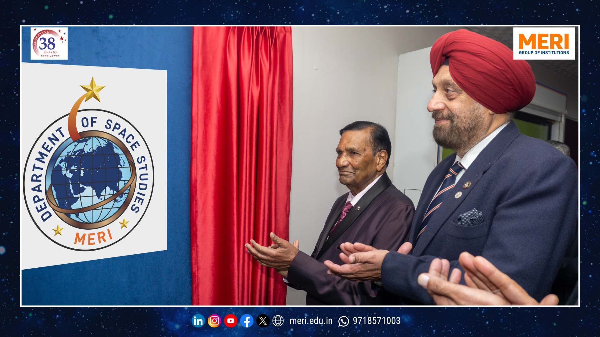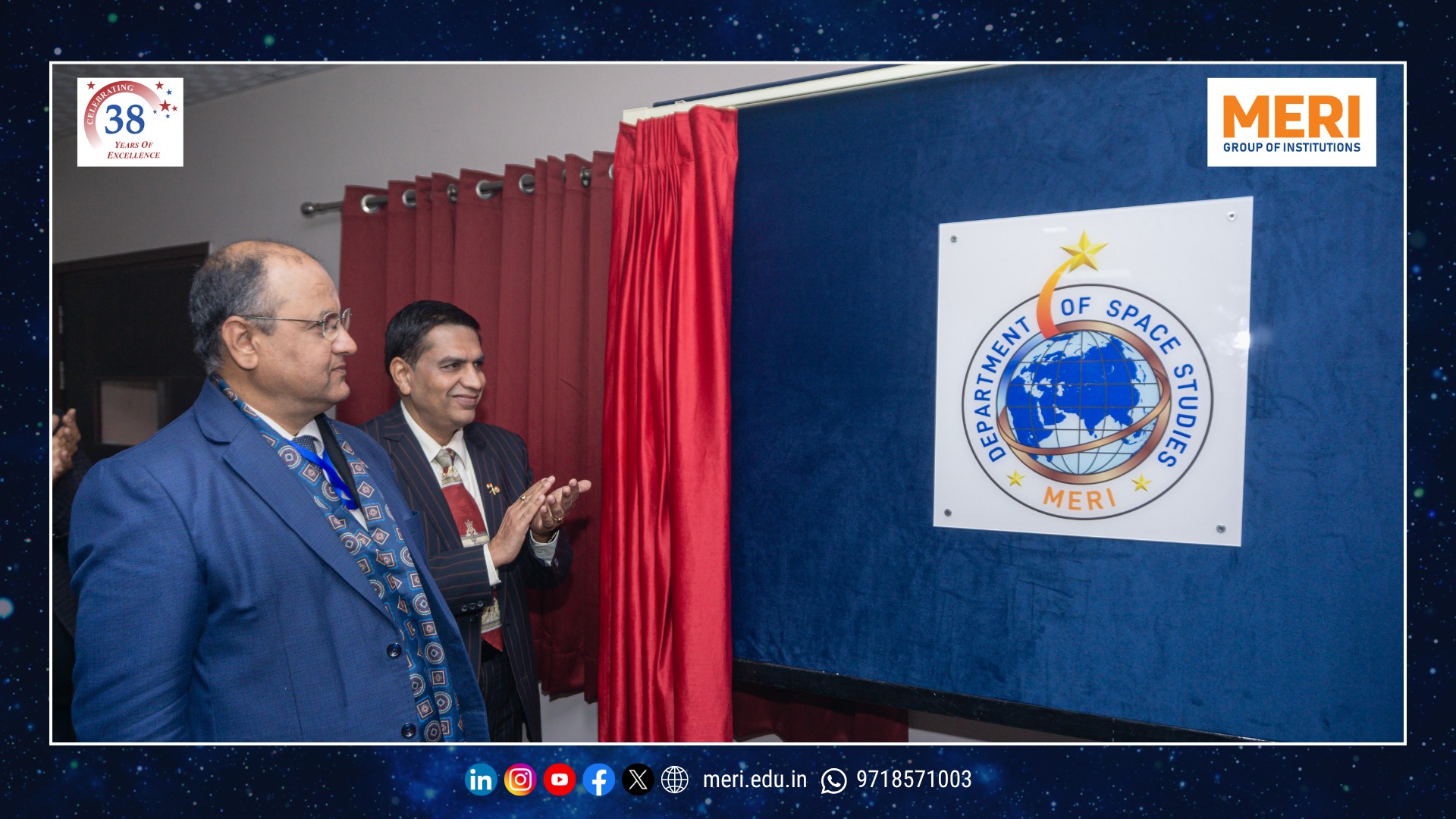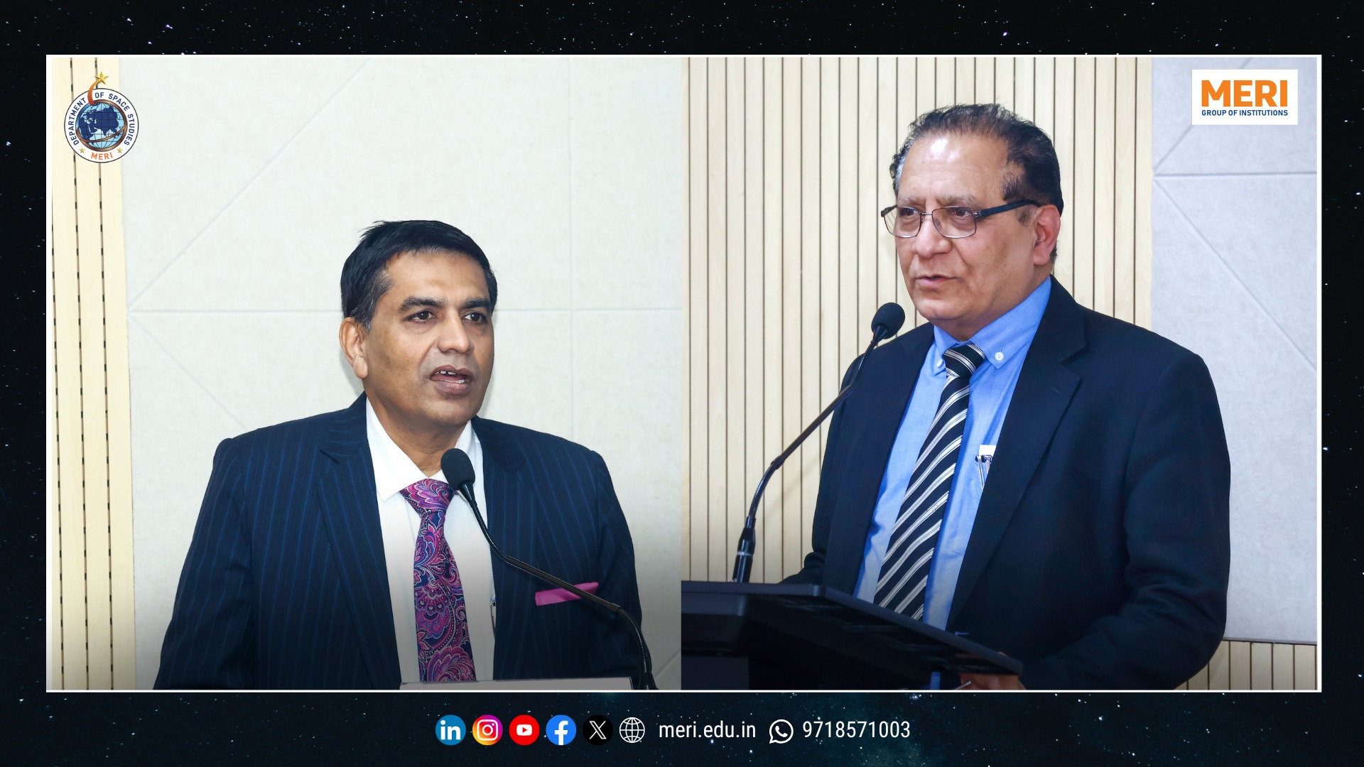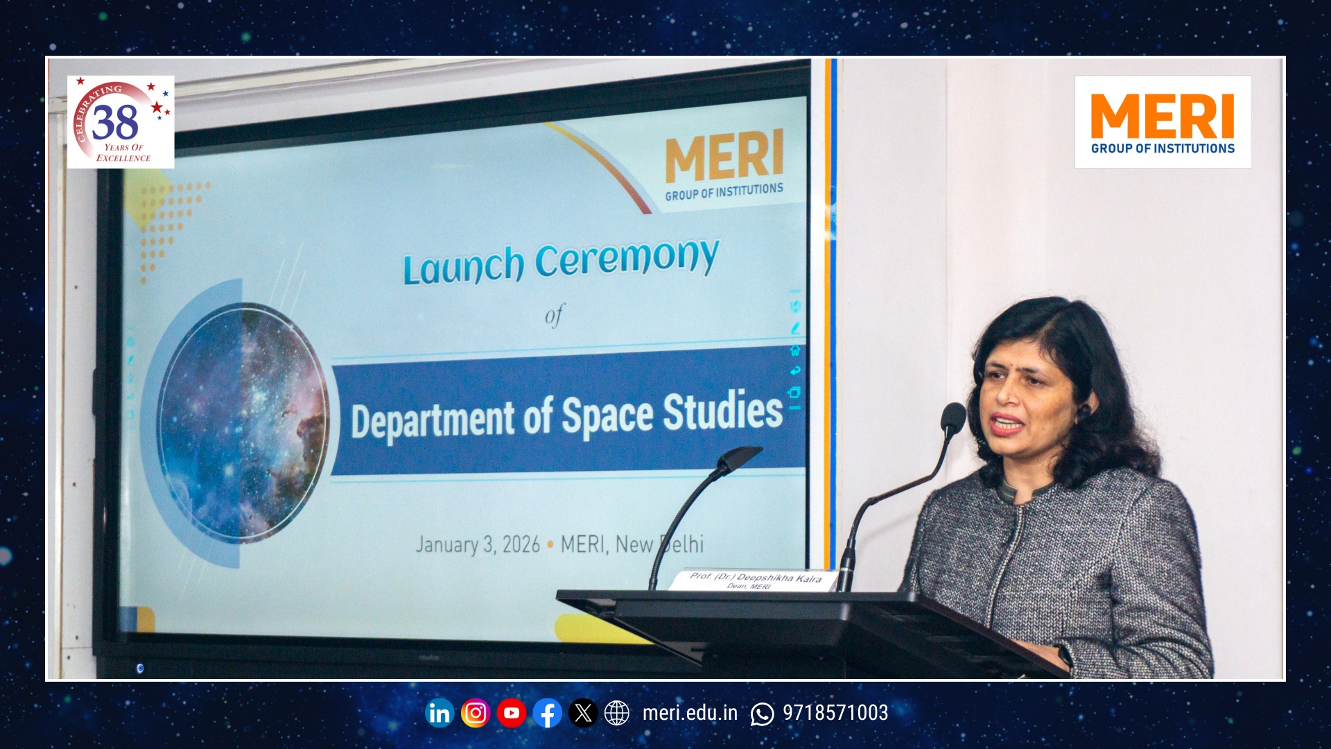 The Management Education and Research Institute (MERI) marked a key academic milestone with the launch of its Department of Space Studies, inaugurated by Sh. I. P. Aggrawal, Chairman, MERI Group of Institutions. Held with strong academic enthusiasm, the programme reaffirmed MERI’s commitment to futuristic and interdisciplinary education. The unveiling of the department’s digital logo highlighted the expanding scope of space science—integrating technology, management, policy, and innovation in alignment with India’s emergence as a techno-economic power.